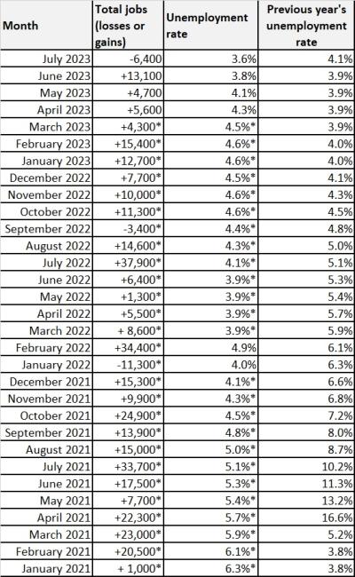 - The preliminary estimated gain of 11,900 jobs for June 2023 was revised to a gain of 13,100 jobs.