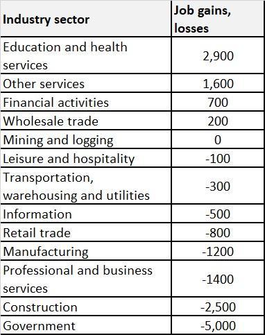 - Professional and business services employment decreased by 1,400 overall, with 1,600 jobs lost in employment services.