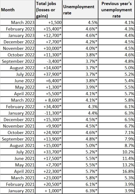 - The preliminary estimated gain of 15,300 jobs for February 2023 was revised upwards to a gain of 15,400 jobs.