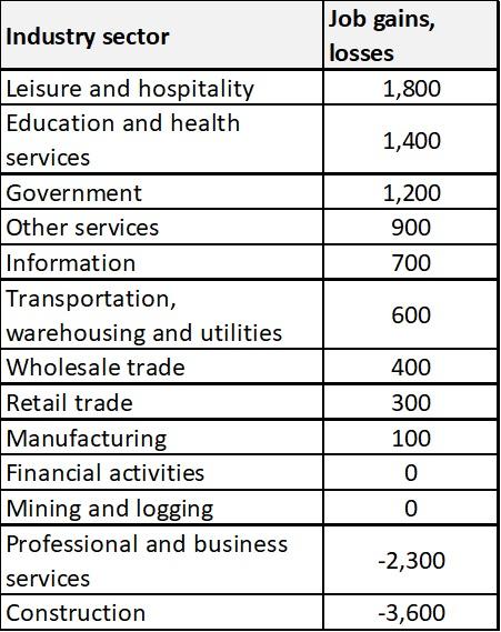 - Professional and business services employment decreased by 2,300 overall, with 2,100 jobs lost in administrative and support services.