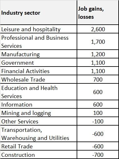 - The largest gains were observed in leisure and hospitality (up 2,600), largely attributable to hiring by restaurants and bars.